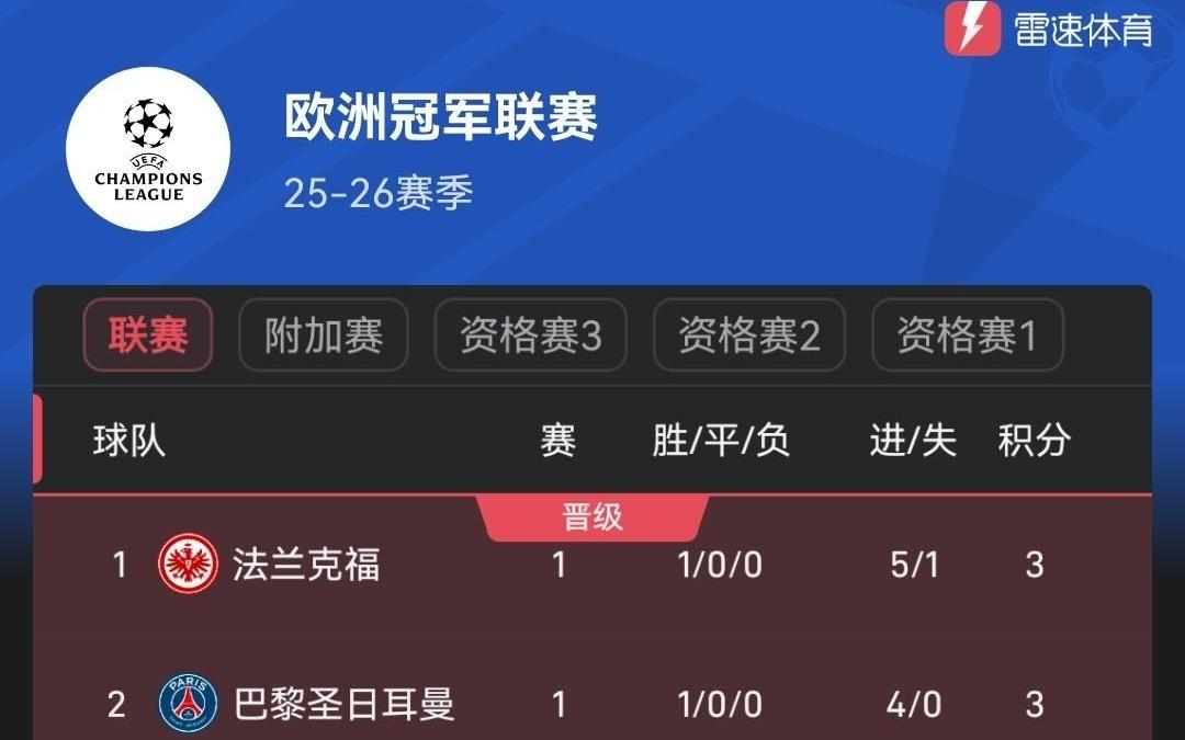 欧冠首轮积分榜:法兰克福暂领跑,大部分豪门悉数取胜