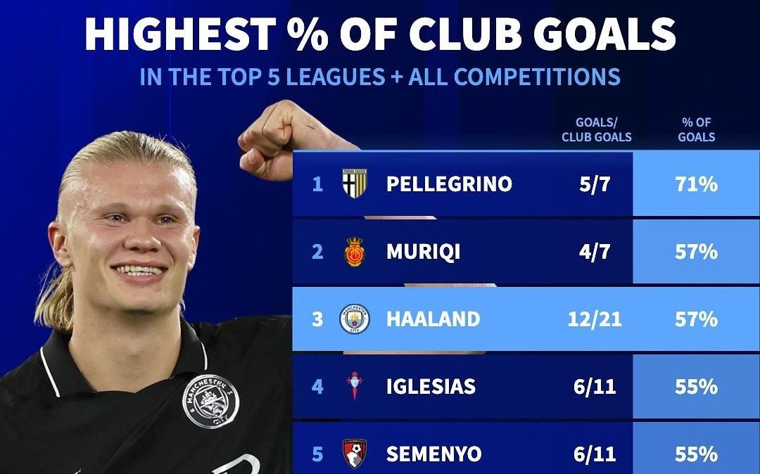 五大联赛球员进球占球队总进球之比:哈兰德57%为第三高