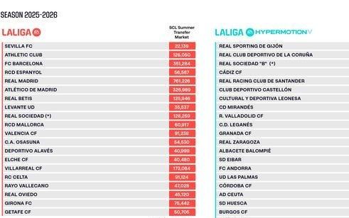 西甲工资帽:皇马7.61亿欧第1巴萨降1亿至3.51亿塞维垫底2200万