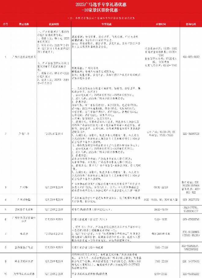 10家票价优惠景区清单(活动解释权以各景区说明为准)。图片来自广州马拉松赛组委会