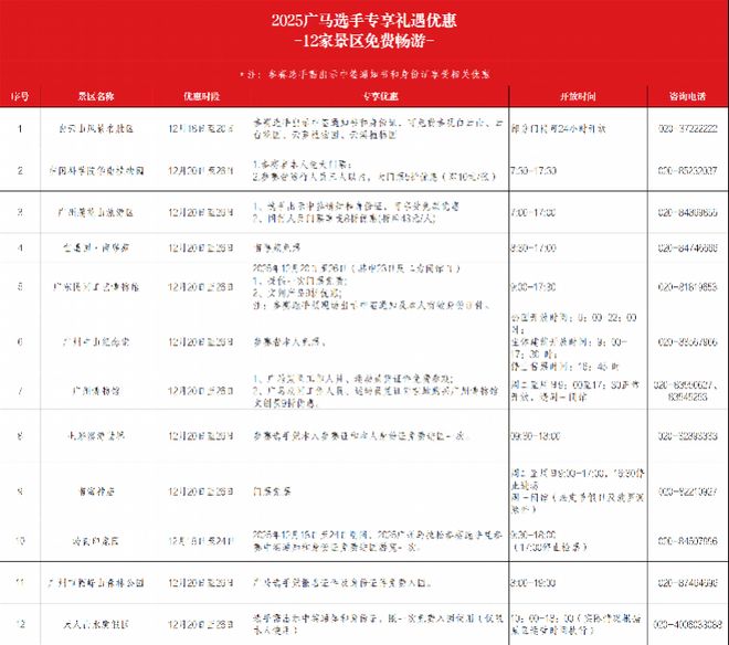 免费参观景区清单(活动解释权以各景区说明为准)。表格来自广州马拉松赛组委会