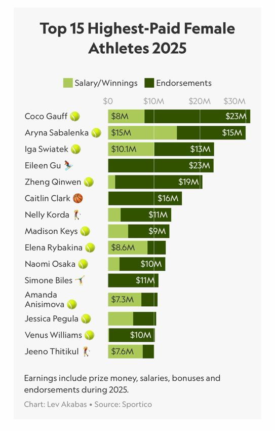 尽管乒乓球运动员代言活跃,但若具体到收入金额,结合职业网坛的高额奖金和个人代言收入,网球运动员仍略胜一筹。美国体育财经媒体《Sportico》于12月发布了2025年世界前15名女子运动员收入榜单。其指出,几十年来,世界收入最高的女运动员的顶级联赛均以网球为主。榜单中的15名女运动员中,有10名是网球运动员,榜首由美国网球新星可可·高芙占领。