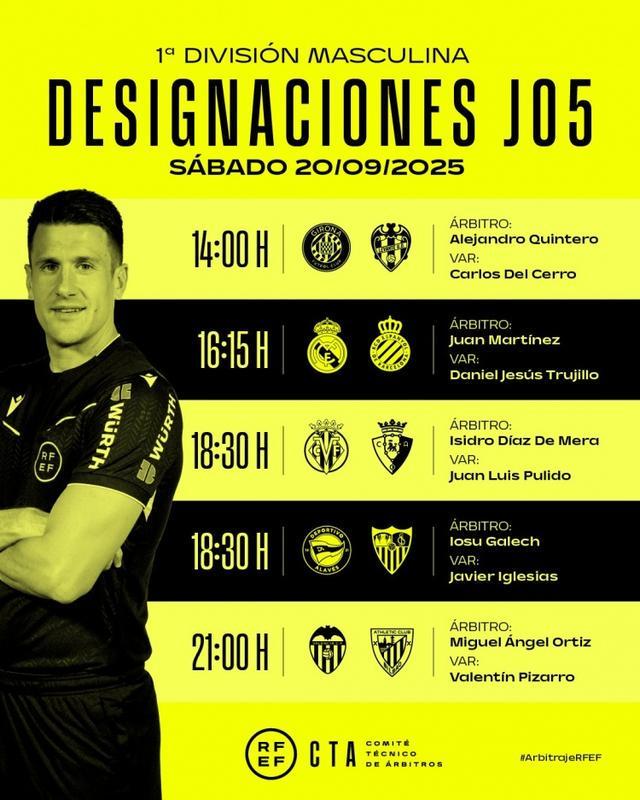 直播吧9月19日宣 西甲官方更新社媒动态,公布了9月20日多场第5轮比赛的裁判安排。