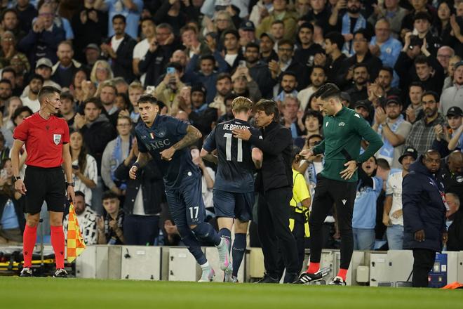 上半场那不勒斯队长迪洛伦佐因为放倒已经形成单刀的哈兰德而被主裁判红牌罚下,在比赛还有一个多小时就得少打一人的情况下,主教练孔蒂只能选择换上跑动能力更强的球员加强防守。