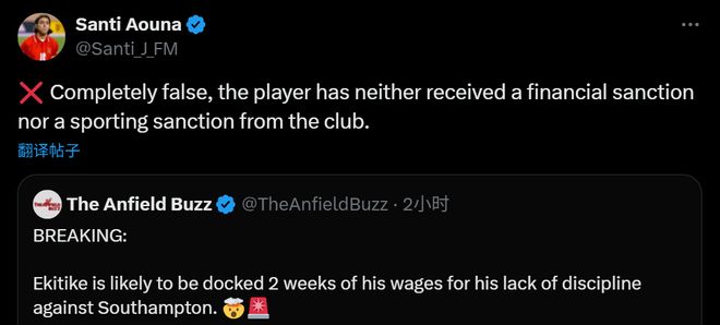 对此,著名记者Santi Aouna进行了辟谣,他在社交媒体发文称,“这是完全错误的,埃基蒂克并没有受到俱乐部的罚款,也没对他进行停赛的处罚。”