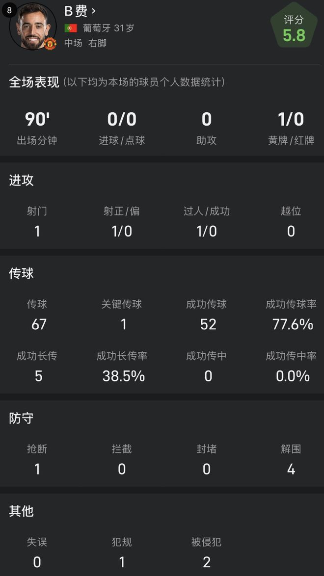 雷速体育9月27日宣 英超第6轮比赛,曼联客场1-3不敌布伦特福德。本场比赛,B费表现低迷,他在第75分钟罚丢了姆伯莫创造的点球,这也是他本赛季第二次罚丢点球。