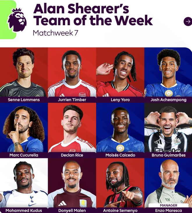 雷速体育10月6日宣 英超第7轮战罢,英超官方公布了阿兰·希勒评选的第7轮最佳阵容,切尔西有三名球员入选,曼联、阿森纳则各有两员。