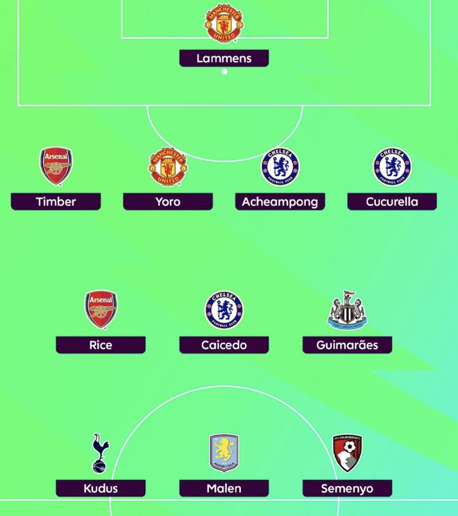 中场:德克兰·赖斯(阿森纳)、莫伊塞斯·凯塞多(切尔西)、布鲁诺·吉马良斯(纽卡斯尔联)