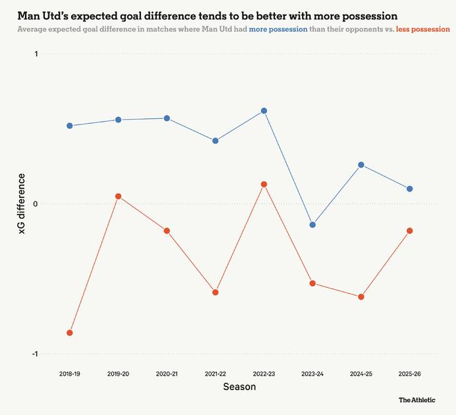 2025-26赛季,曼联在控球率较低时的预期进球值(xG)和预期失球值略差一些,如下方的图表所示。但只要他的球队能控制对手射门的来源(即:来自远射或边路),并且己队能创造出不错的机会,这对主教练来说似乎并不是一个迫在眉睫的担忧。