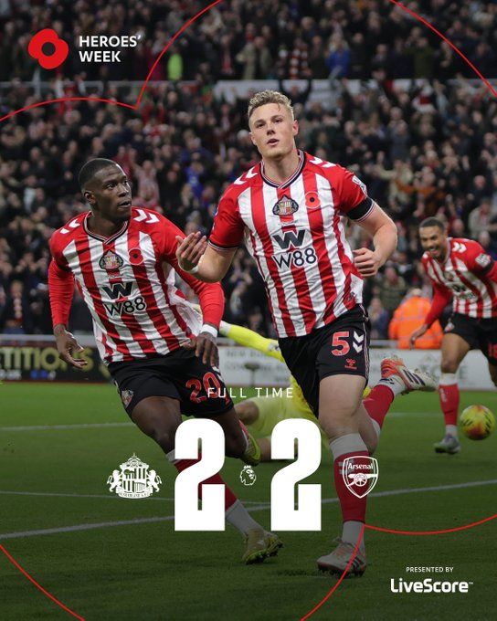北京时间11月9日01:30,英超联赛第11轮,阿森纳客场挑战桑德兰。上半场,巴拉德破门首开纪录。阿森纳半场0-1落后桑德兰。下半场,梅里诺助攻萨卡扳平,苏维门迪有一脚射门击中横梁,随后特罗萨德世界波反超,布罗比补时绝平。最终阿森纳2-2战平桑德兰,阿森纳各项赛事10连胜势头被终结,暂以7分优势领跑英超。