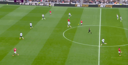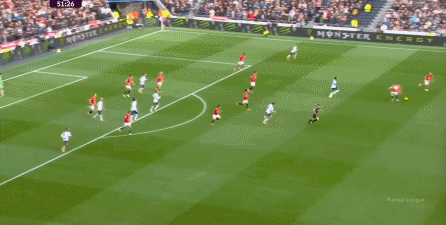 虽然曼联在进攻端的布置在理论上稍有问题,库尼亚和阿玛德-迪亚洛在各自位置上的表现不足很清晰,导致上半场的反制能力没能拔到理论上的最高值,但曼联还是先进一球,而且线路上恰好是右路的阿玛德-迪亚洛传给左路的姆贝乌莫:
