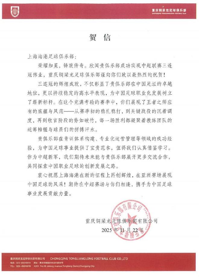 北京时间11月22日,中超第30轮,上海海港1-0客胜大连英博实现中超三连冠。赛后,重庆铜梁龙送上贺信。